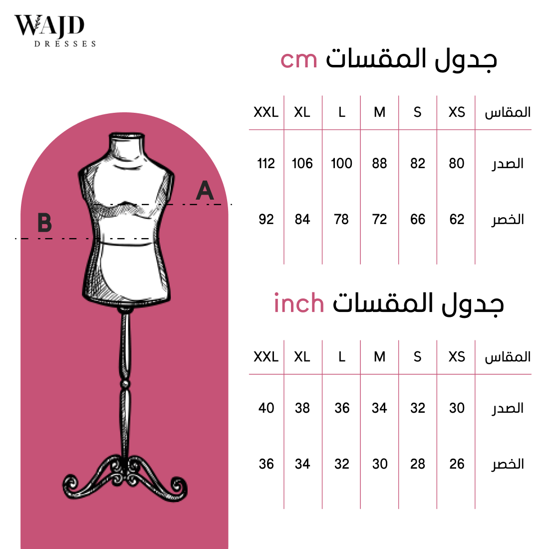 المقاسات المتوفرة:XS: خصر 26 - صدر 32.S: خصر 28 - صدر 34.M: خصر 30 - صدر 36.L: خصر 32 - صدر 38.XL: خصر 34 - صدر 40.XXL: خصر 36 - صدر 42.؟تصميم فستان سهرهالقماش باربي باجيت منفصل